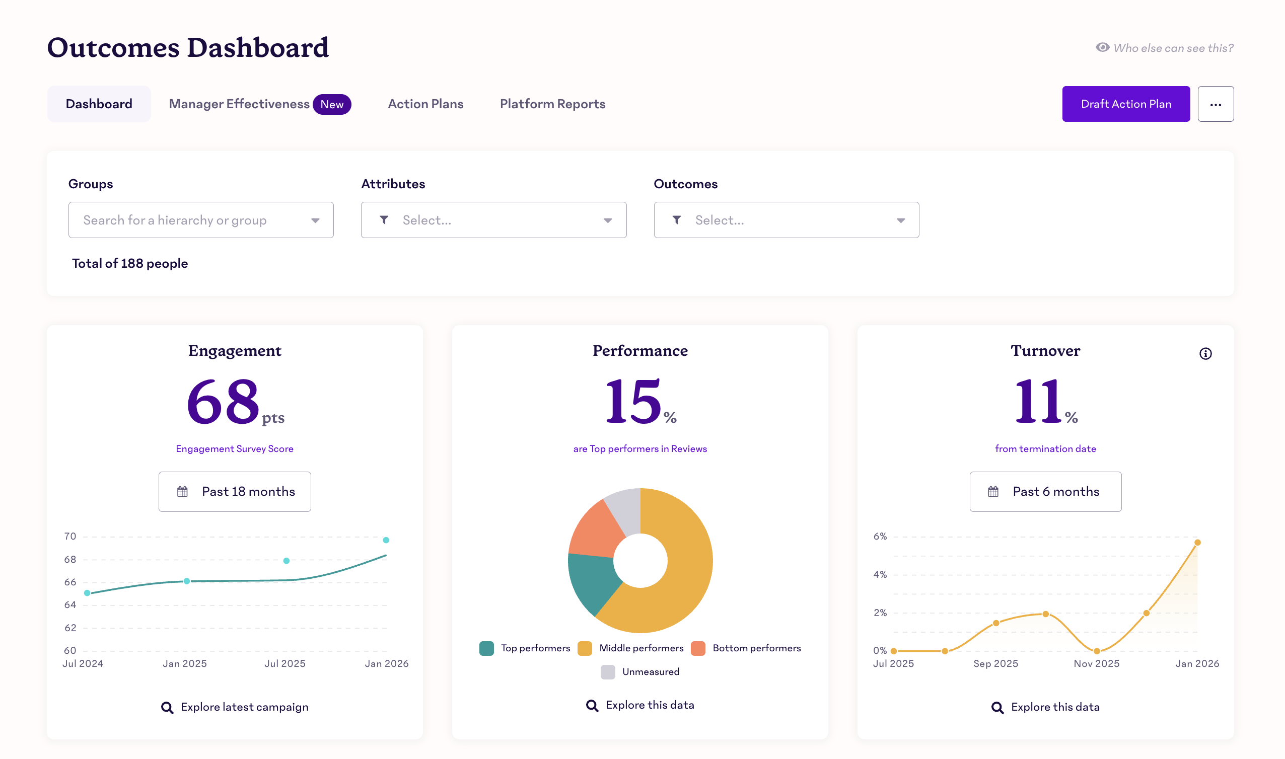 The HR Outcomes Dashboard is an interactive reporting tool. It helps HR leaders and execs measure and improve key outcomes: Manager Effectiveness, Engagement, Performance, and Turnover.
