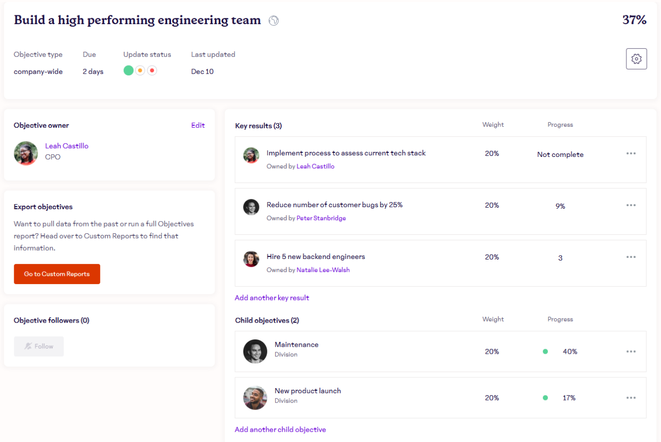 Anyone in your organization can use the Objectives tab to see OKRs and follow their progress in real-time. Click into an objective to open its details page.