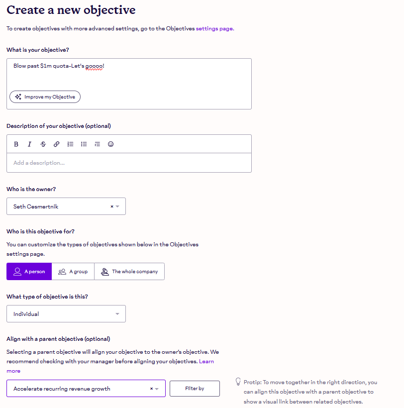 In the screenshot above, you can see that Seth also aligned his objective with the company-wide objective titled "Accelerate recurring revenue growth".