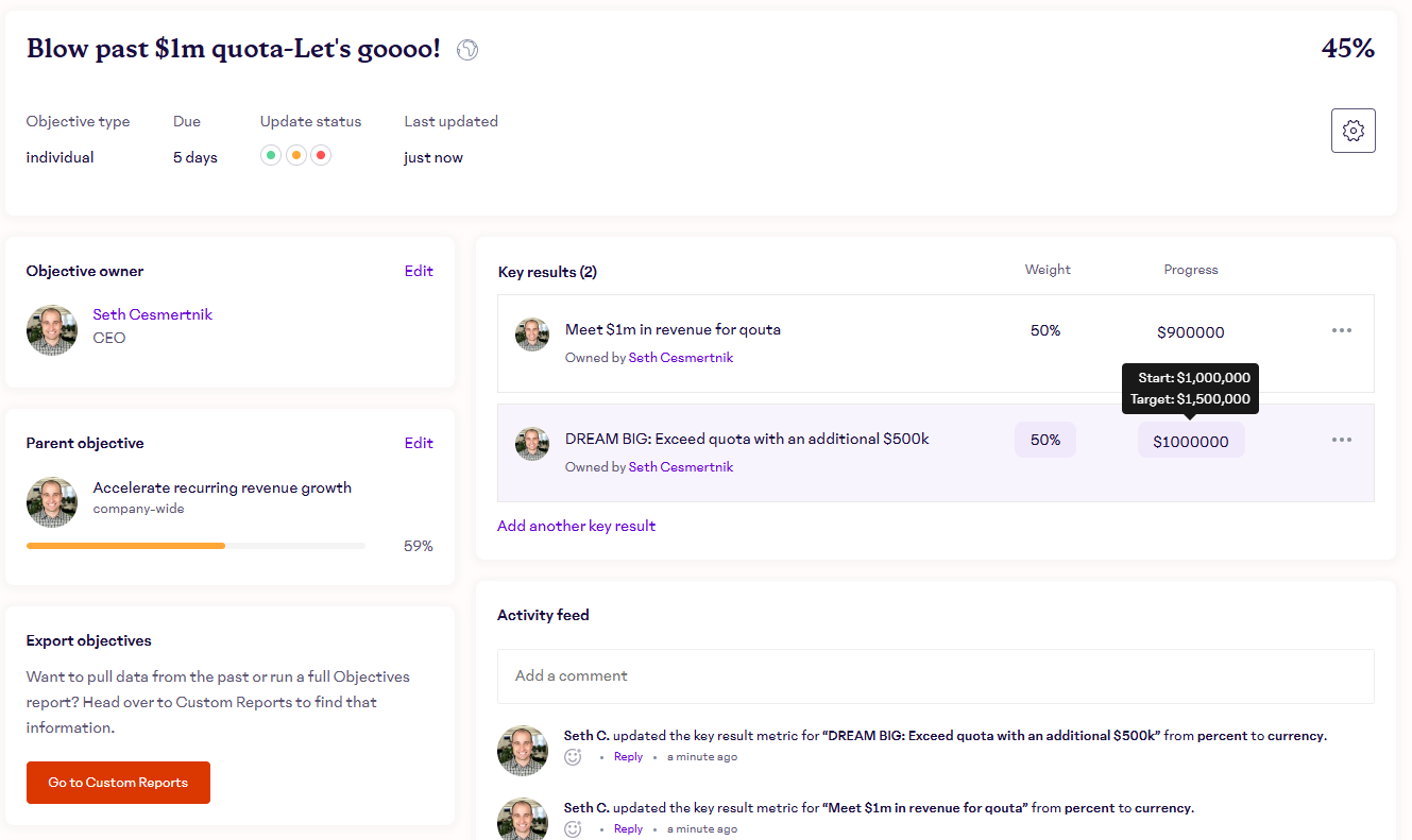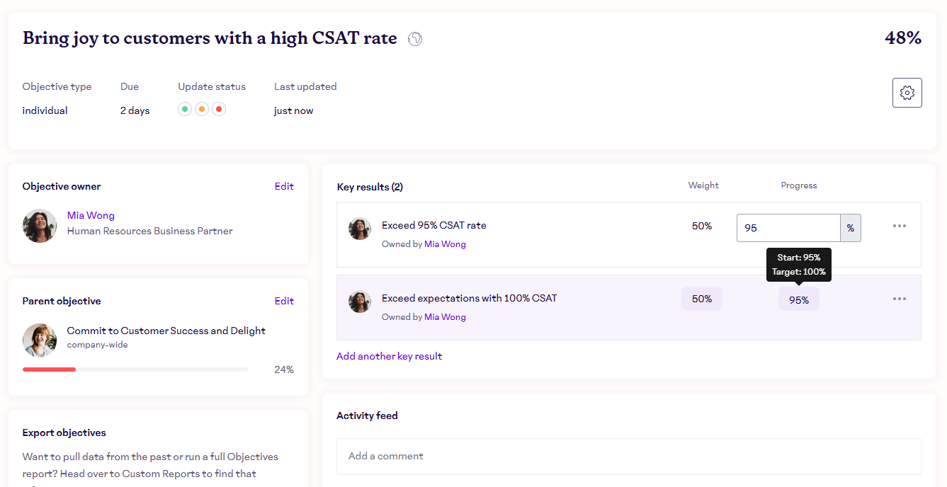 On an objective's details page, any person who has visibility into the objective can leave a comment in the activity feed. The objective owner can also use this space to add context to the objective, be it with a description of the reasoning behind why the objective was created. Boom. The random title mystery has been solved.
