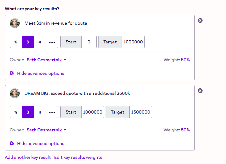 Seth not only set a key result regarding his quota but also added an aspirational key result to double his monthly quota amount. Seth can use the "$" option to easily add in the starting and target quota values. Using these options makes it easier for Seth's reviewer and teammates to know exactly how far along he is on his quota objective.