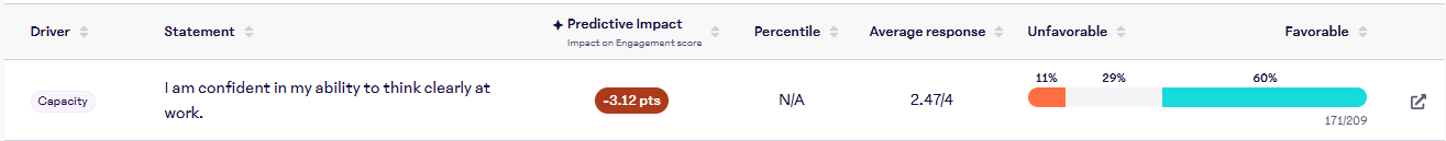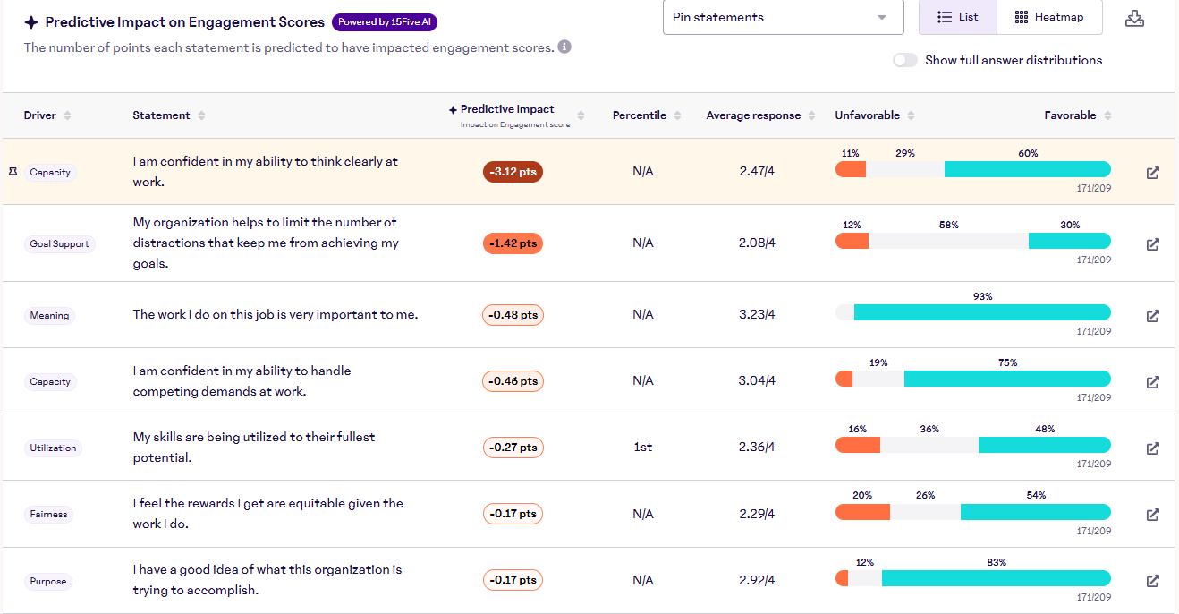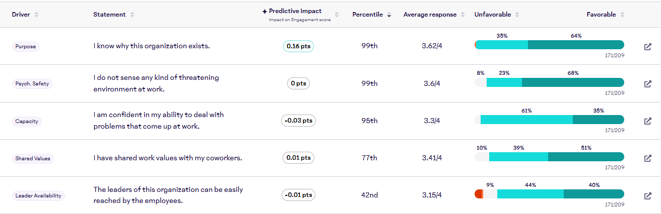 - Predictive Impact: How much that statement influenced the overall engagement score..