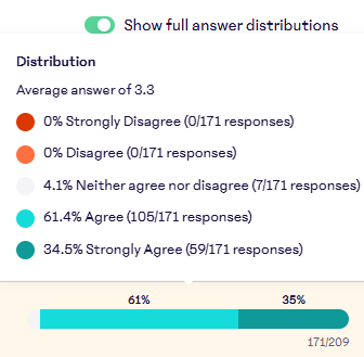 - For a more detailed view, toggle on the “Show full answer distributions” option in the top-right corner of the table. This will display responses across the full 5-point scale from Strongly Disagree to Strongly Agree—mirroring the original survey format.