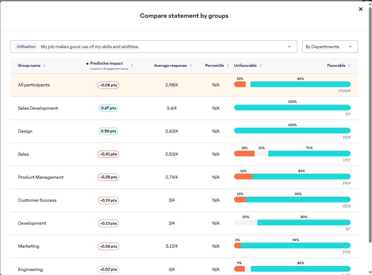 - You can also compare statement responses by group (e.g., Departments, Locations, Manager Teams), giving you targeted insight into how different parts of the organization are experiencing the same question.