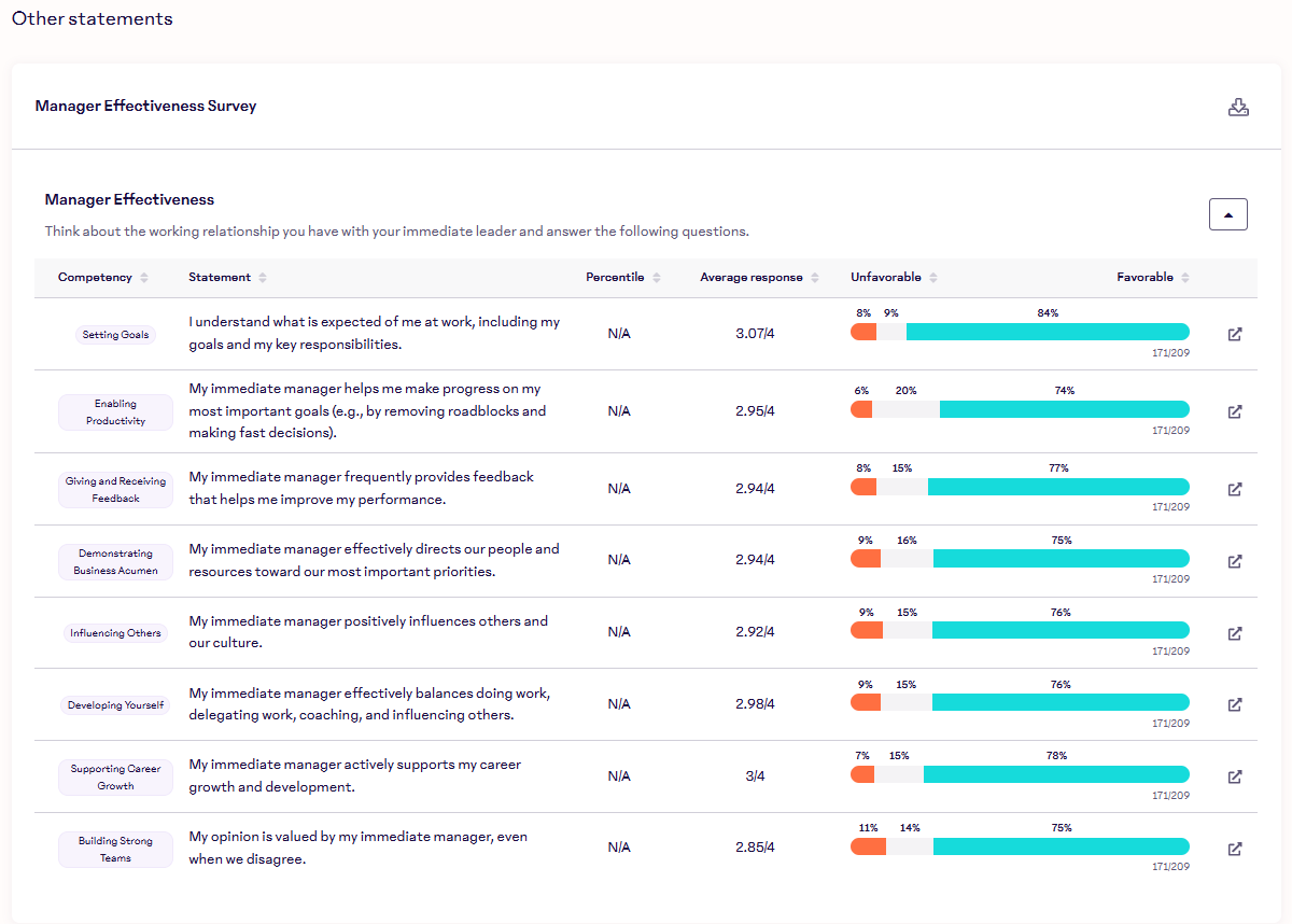 These statements offer valuable context and insight beyond the core engagement questions. While they don’t include Predictive Impact Scores, they still provide meaningful data you can use to guide decisions.