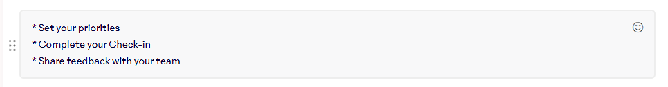 That means you can use markdown to style your text in Objectives, Request Feedback, Check-ins, High Fives, and even Best-Self Review®.