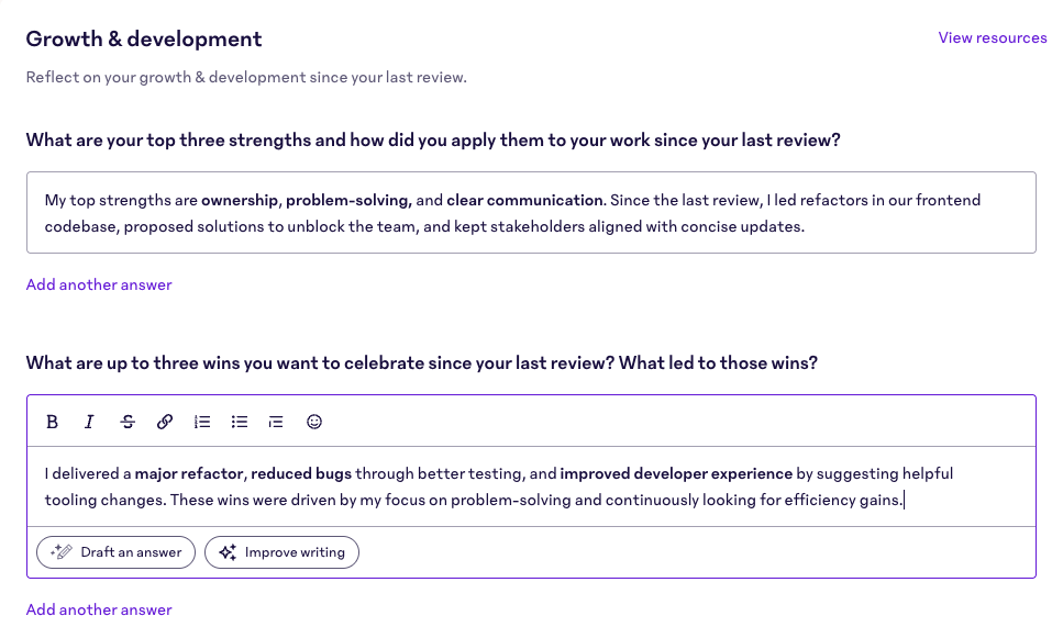 Using relevant data, 15Five AI can generate a first-draft response to review questions to help you begin writing.