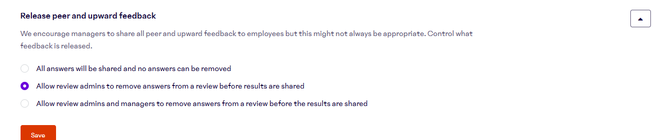 Decide who can remove peer or upward review answers before they’re shared with the participant. Removing feedback hides it from the participant but does not delete it.