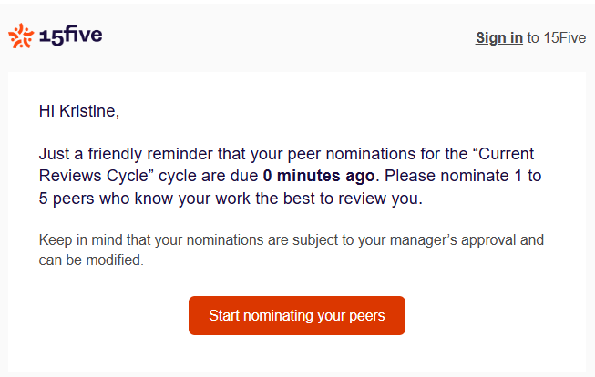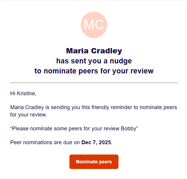 - When: When a peer has not nominated the minimum number of peers within 3 days of the peer nomination deadline. This email is also sent out the day peer nominations are due if enabled in company-wide notification settings.