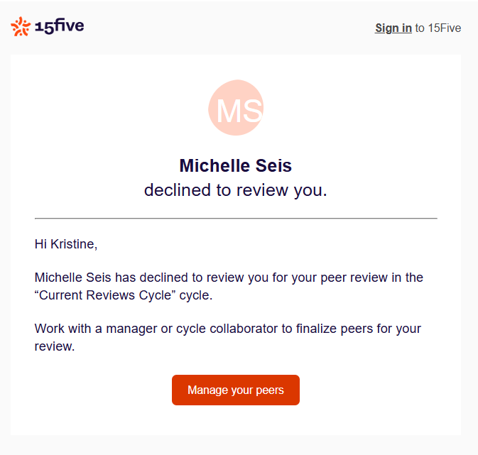 - What: General email containing important review cycle details. Also contains a link to view Peers.