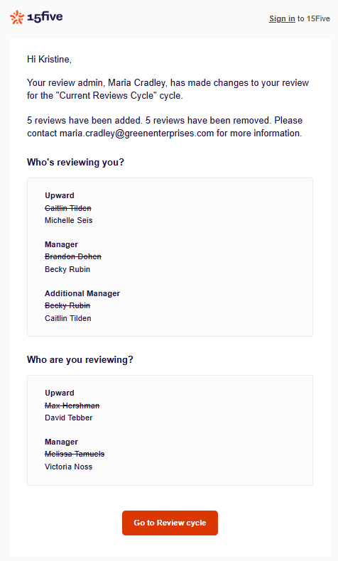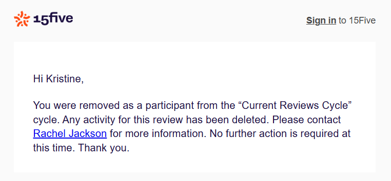 This email is sent to removed participants informing them that they were removed from the review cycle and no longer need to participate in the review. |