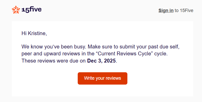 Doing reviews at a company can feel like directing an orchestra—there are a lot of moving parts and people to manage. To take the burden off of review admins, we automatically inform review participants of important milestones and remind them when something is due. We also send emails that are action-based, meaning when someone takes an action, the email is triggered. In this article, we'll walk through the various notifications that may be sent to participants and review writers throughout the course of a performance review cycle.