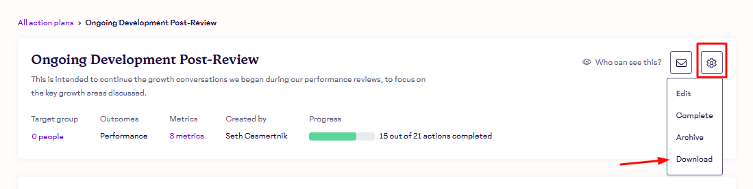 Users can now download Action Plans directly from the Action Plan menu, making it easier to view, share, and store progress outside of 15Five. This allows teams to easily export Action Plans for reporting, alignment, audits, and long-term record-keeping all without leaving the 15Five platform.