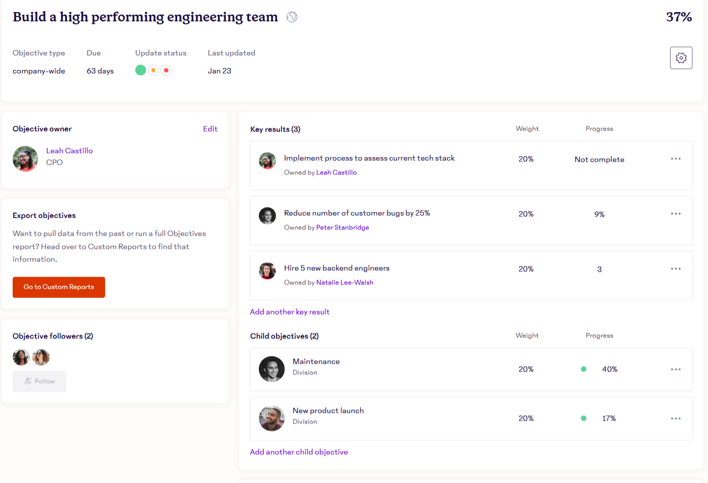 If you want to receive updates on an objective you don't own, you can follow the objective. Following an objective allows you to receive notifications about updates to objective status and key results, enabling you to keep up-to-date on projects and make sure objectives stay top-of-mind.