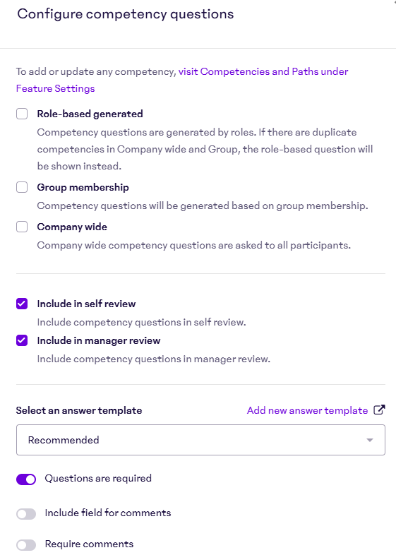 Review admins can choose whether competency questions appear in self-reviews, manager reviews, or both. This flexibility allows you to capture feedback from the right perspectives.