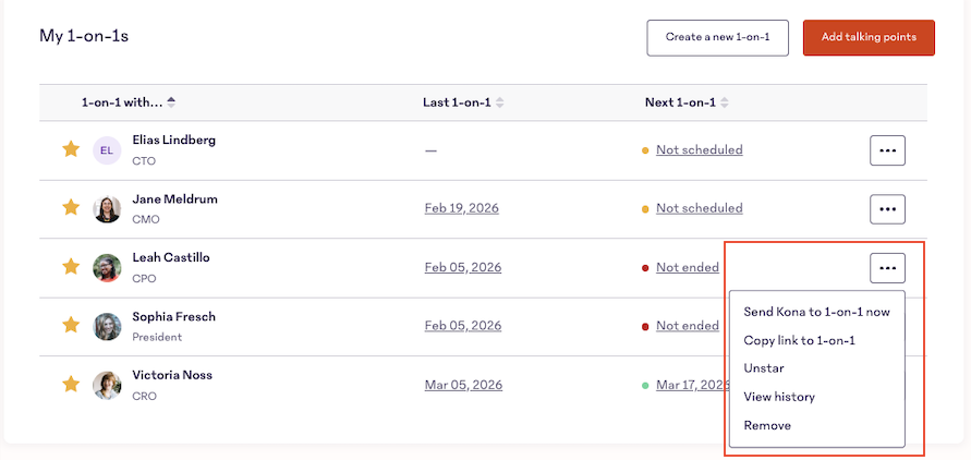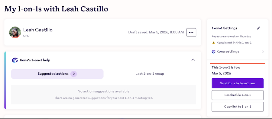 Use the Send Kona to 1-on-1 button when you want to make sure Kona joins the correct 1-on-1—especially if the timing changed and Kona might have missed the live meeting.