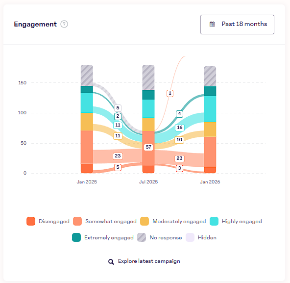 Click 🔍 Explore latest campaign to view detailed results from your most recent engagement survey. Learn how to analyze engagement campaign results →