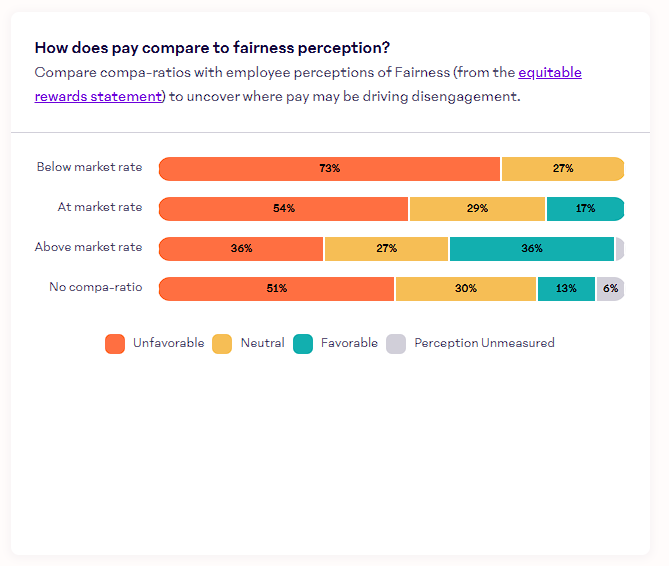 Use this insight to understand how employees feel about fairness in their compensation, segmented by market rate category. Learn more →