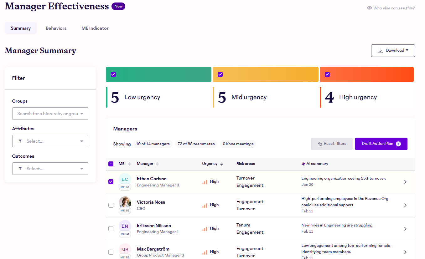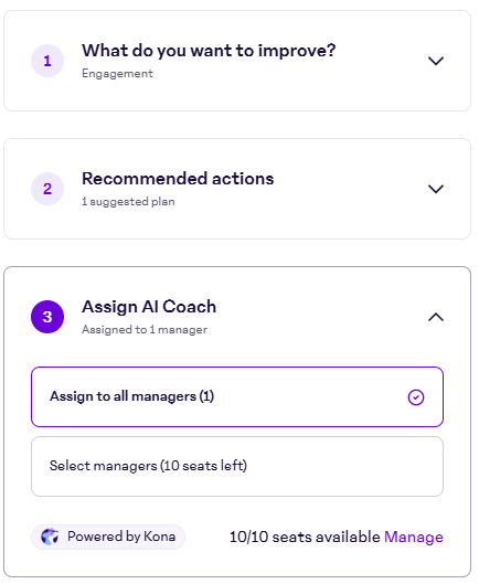 If you want to onboard a specific group of managers to Kona Coach in a structured way, you can assign AI Coach (Kona) access through a Manager Effectiveness Action Plan. This is helpful when you want managers to receive onboarding tasks and notifications as part of a broader development plan