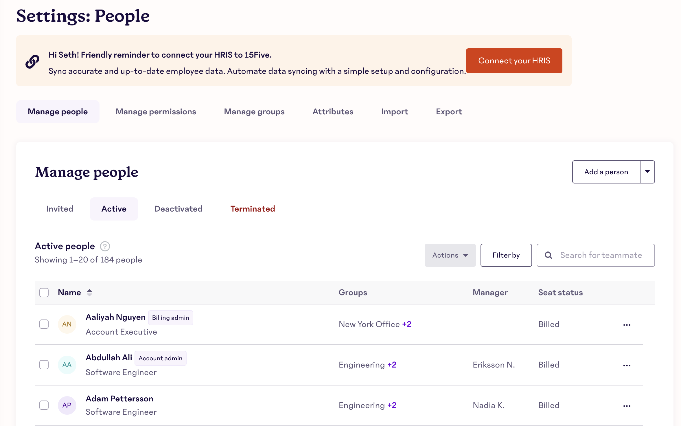 The "Manage People" page is your hub for managing accounts and invite settings for your team. Here, you can update managers and Check-in due dates, manage invite settings, deactivate/reactivate people, add vacations for people, add termination data, and more. There are three tabs on the "Manage People" page— Active, Invited, and Deactivated— which we'll explore in-depth in this article.
