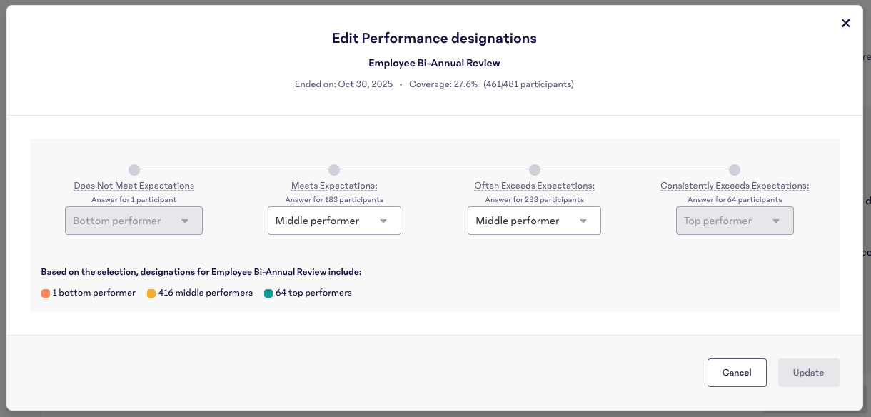 HR admins have more flexibility in how performance scores translate into performance designations like Top, Middle, and Bottom Performer. See our Configure HR Outcomes article for how to access this.